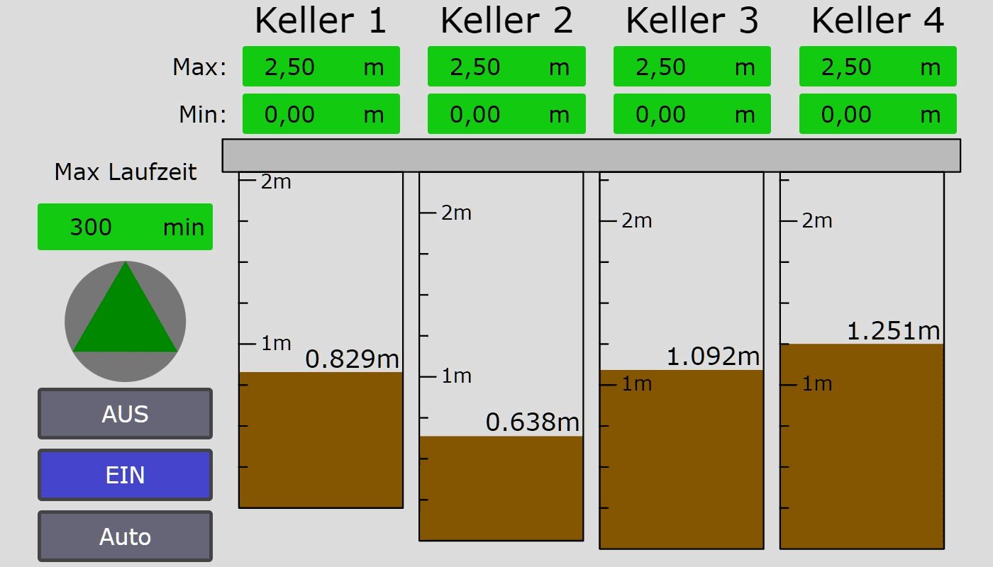 Niveausonden verschaffen einen Übersicht über die momentane Güllemenge und den verfügbaren, freien Gülleraum. Unser System ermöglicht automatisches Umpumpen der Gülle von einem Güllekeller in den anderen mit Einniveau, Ausniveau und Pumpen Laufzeitüberwachung. Güllemixer, Güllespeperator werden erst ab einem Mindestniveau freigegeben und können über eine Wochenzeitsteuerung oder in Abhängigkeit von Photovoltaik Überschussleistung automatisch ein- und ausgeschaltet werden. Beim Güllespeperator wird zusätzlich die bearbeitete Güllemenge und die benötigte elektrische Energie aufgezeichnet. Motorschutzschalter- oder Leitungsschutzschalter Kontakte können ebenfalls überwacht und alarmiert werden falls diese nicht in der richtigen Position sind.